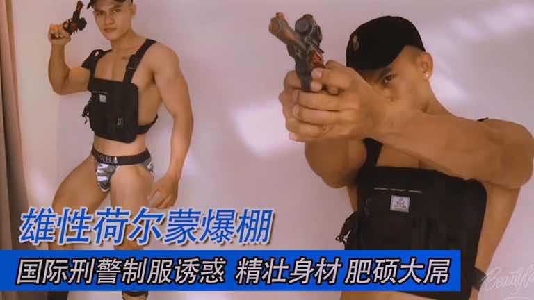 国际刑警上演制服诱惑!身穿丁字裤,防弹衣,举枪的动作简直是雄性荷尔蒙爆棚!肥硕大屌更是让人欲望满满