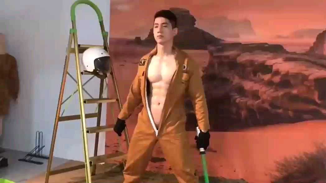 男模拍片现场,涂油凸现身材,最后被玩到射