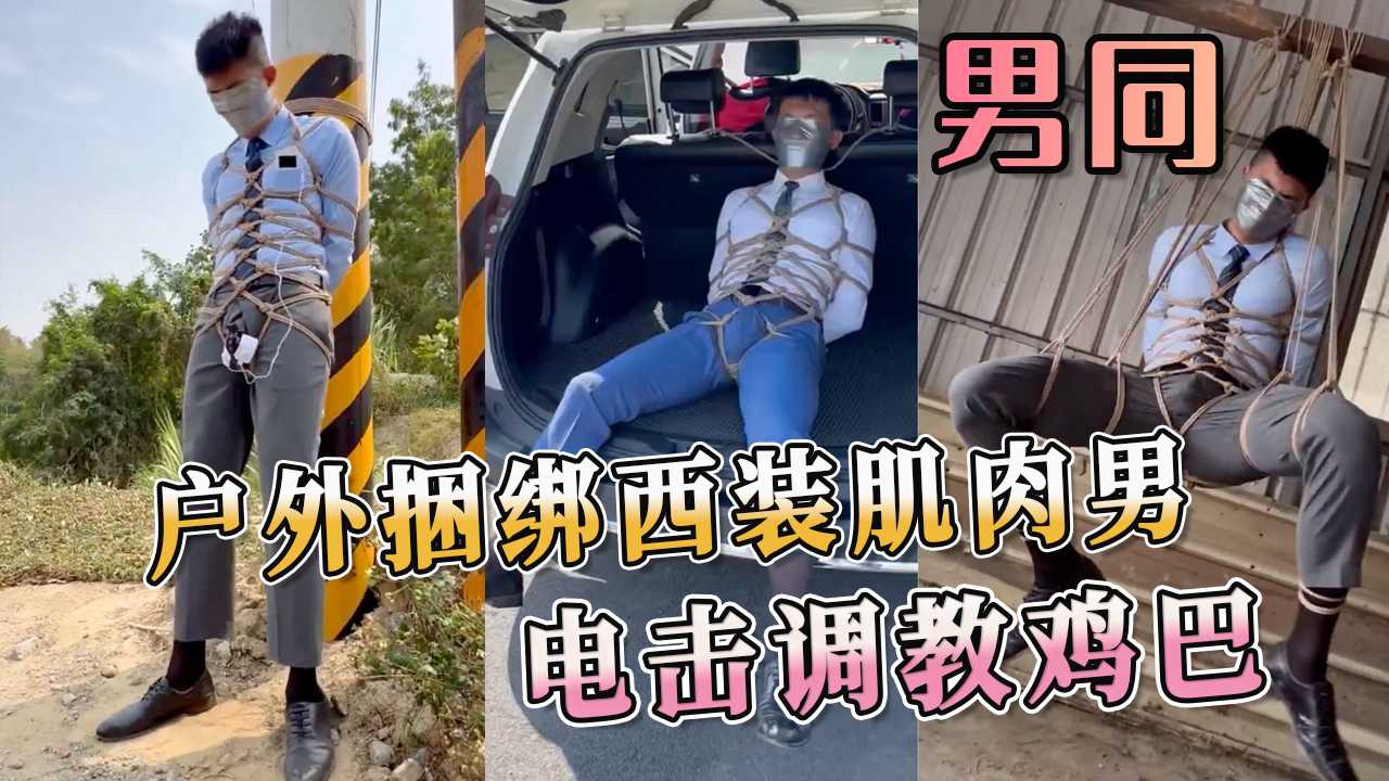 户外捆绑西装肌肉男,电击鸡巴调教到硬得发紫,西装都湿透了