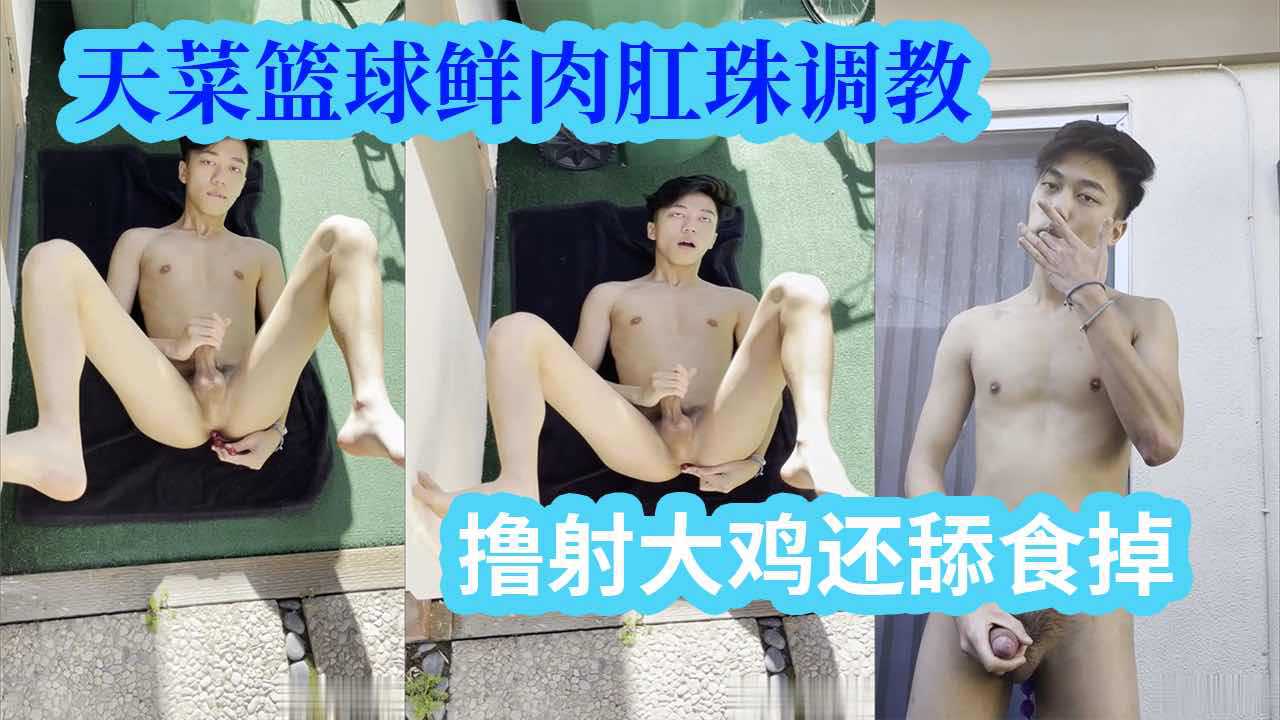 天菜篮球鲜肉,屋外院子里肛珠调教,撸射大鸡还舔食掉
